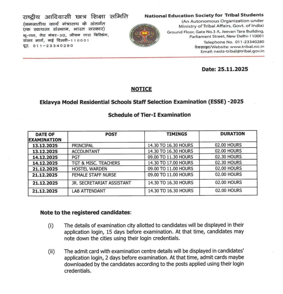 इस भर्ती में प्रिंसिपल, PGT, TGT, हॉस्टल वार्डन, महिला स्टाफ नर्स, अकाउंटेंट, क्लर्क (JSA), लैब अटेंडेंट और अन्य सहायक स्टाफ के पद शामिल हैं।