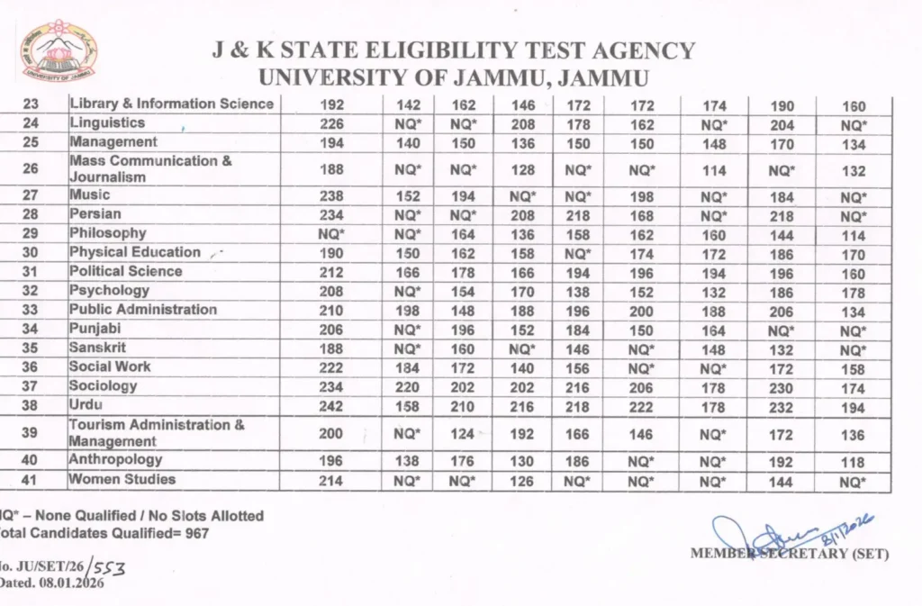 JKSET एग्जाम रिजल्ट PDF के अनुसार, कुल 967 कैंडिडेट्स ने कट ऑफ मार्क्स के बराबर या उससे ज़्यादा मार्क्स लाए हैं और उन्हें JK SET एग्जाम में क्वालिफाई घोषित किया गया है। इंडिविजुअल JKSET स्कोर कार्ड 2025, 10 जनवरी 2026 को https://www.jujkset.in/ के ऑफिशियल पोर्टल पर जारी किया जाएगा। एलिजिबिलिटी टेस्ट में क्वालिफाई करने वाले कैंडिडेट्स डॉक्यूमेंट वेरिफिकेशन प्रोसेस के लिए एलिजिबल हैं, जिसके दौरान उन्हें अपने ओरिजिनल एलिजिबिलिटी डॉक्यूमेंट्स के साथ वैलिड रिजर्व्ड कैटेगरी और डोमिसाइल सर्टिफिकेट दिखाने होंगे।